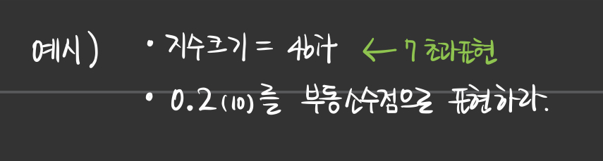 - 예를 들어, 지수 표현을 4bit 만큼 잡는다면 7만큼의 초과표현을 사용하면 된다.