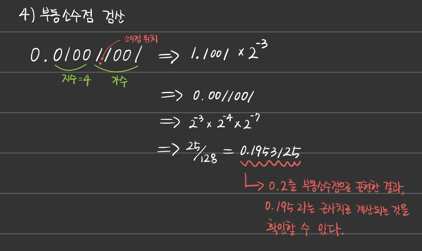 - 부호(1비트) / 지수(3비트) / 가수(4비트)로 구성하게 된다.