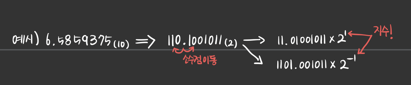 - 그러므로 부동 소수점에서는 실수를 표현하기 위해 정규형을 사용한다.