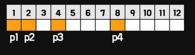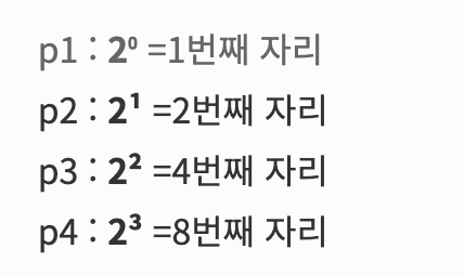 - 체크 비트는 2의 n승번째 자리에 지정되므로 다음과 같은 자리에 지정 된다.