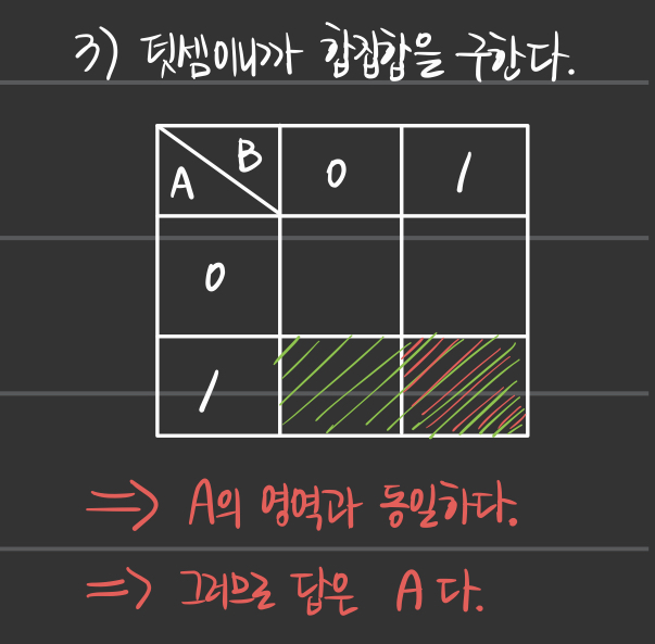 - 집합에서 집합 이름 위에 짝대기를 그으면 NOT을 표현한다.