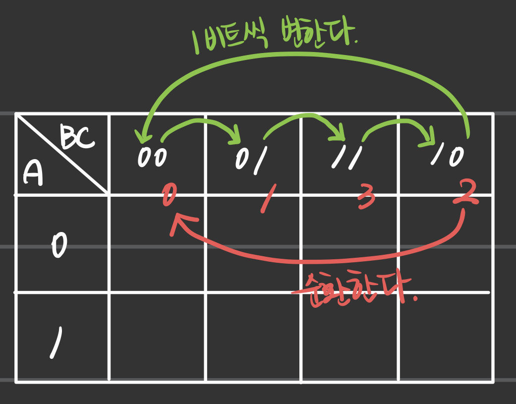 - 카르노 맵은 변수가 순차적으로 증가하지 않는다.
