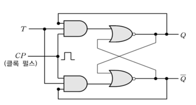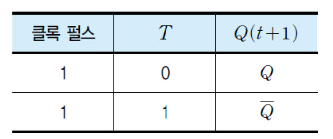 - JK 플립플롭의 J와 K 입력을 묶어서 하나의 입력신호 T로 동작시키는 플립플롭이다.