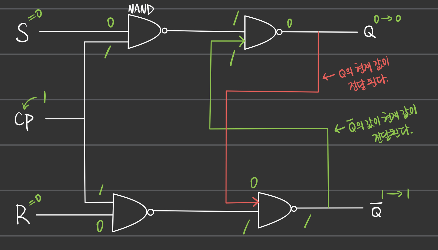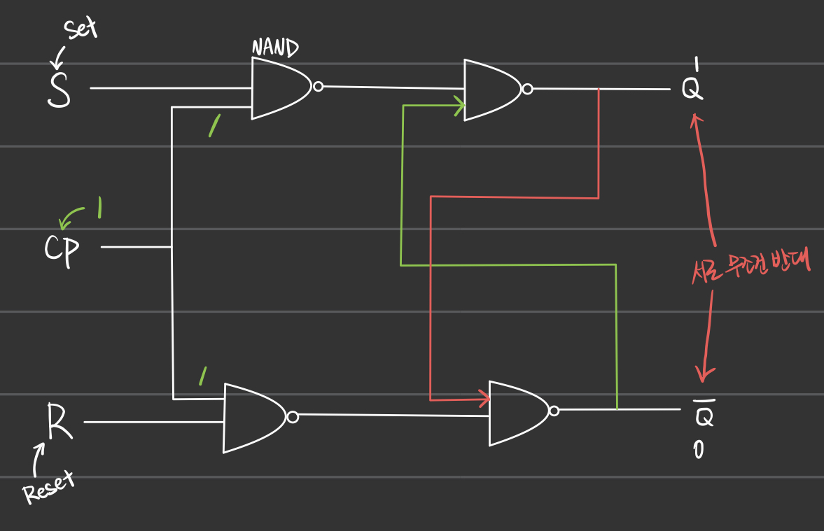 - 위의 그림처럼, R과 S값을 기반으로 NAND 연산을 통해 다음 값을 구한다.