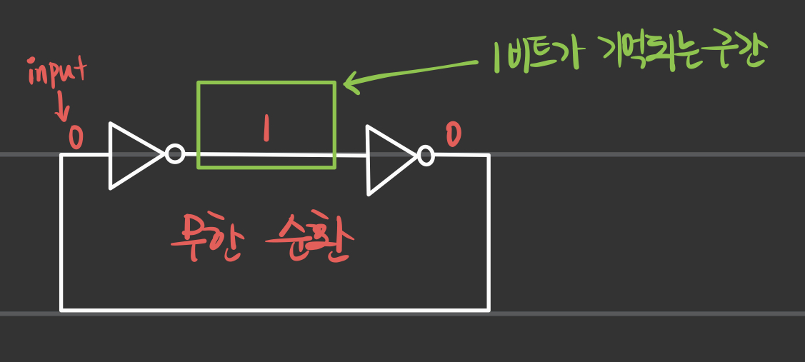 - 무한히 순환하는 구조로 인하여 NOT과 NOT 사이에 1비트가 계속 살아있게 되는 구조다.