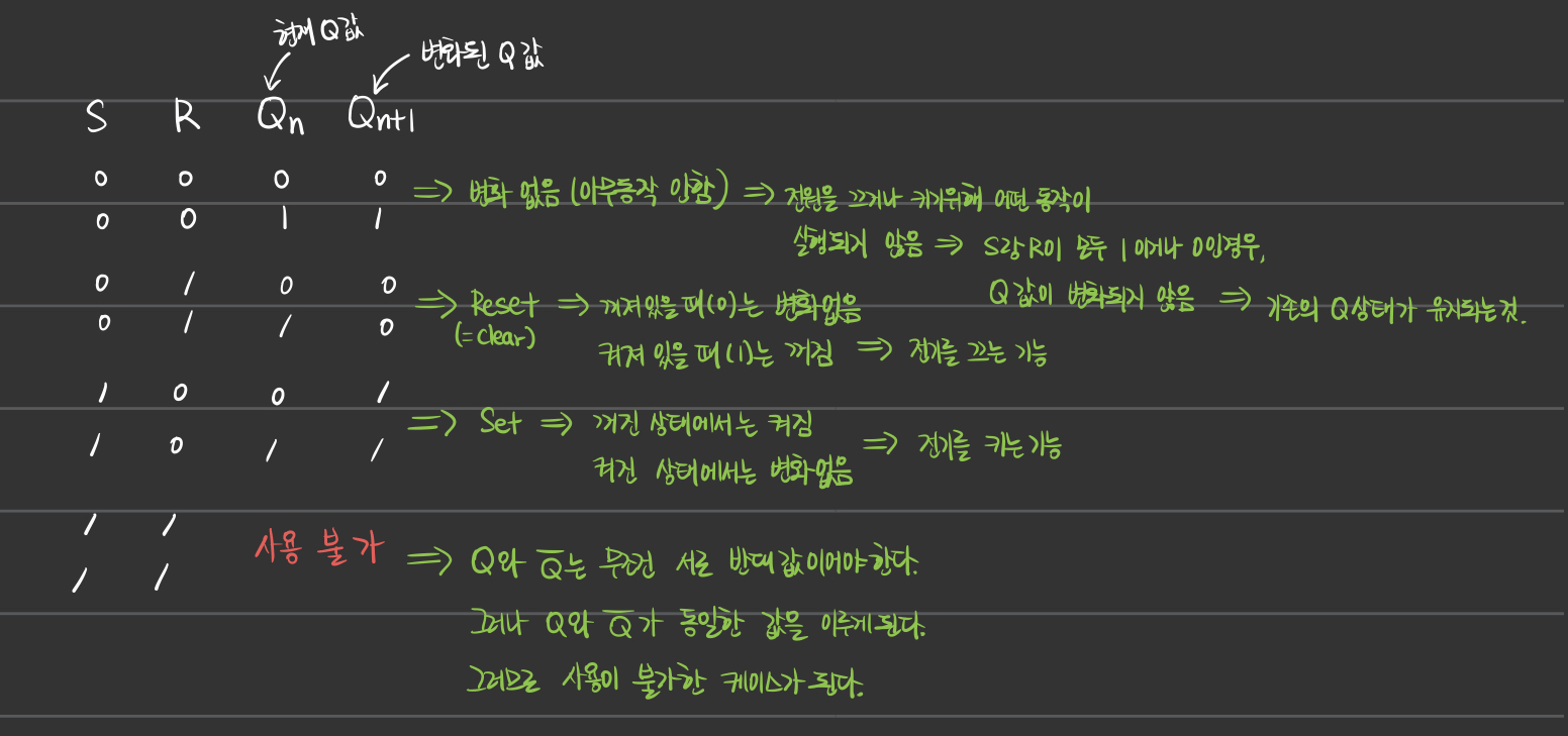 - 입력이 0이 되면 이전상태(Q)의 값이 그대로 출력된다.