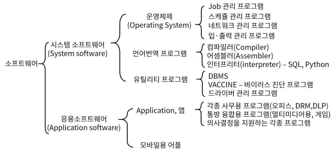 - SW는 크게 두가지 분류로 나뉘는데, 시스템 SW와 응용 SW로 나뉜다.