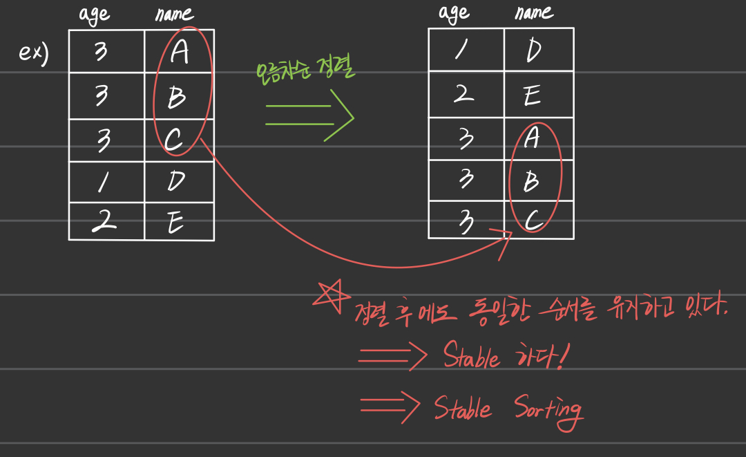 - 정렬 알고리즘은 안정적(stable)인가, 불안정적(unstable)인가로 분류된다.