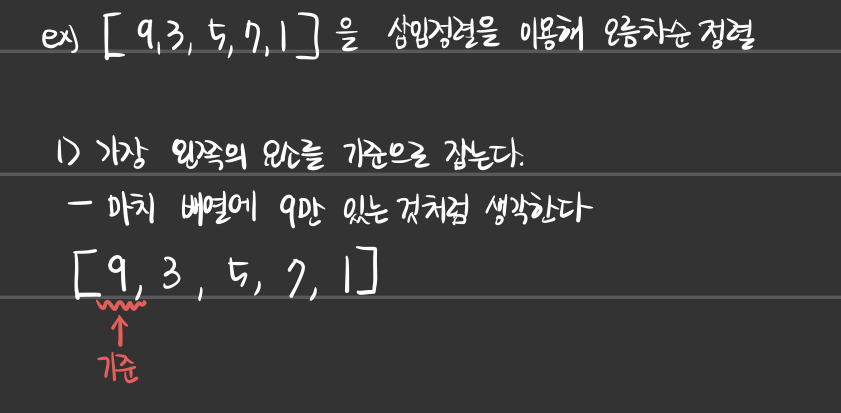 - 조건에 맞는 적절한 곳에 배열의 요소를 삽입하여 정렬하는 방법이다.