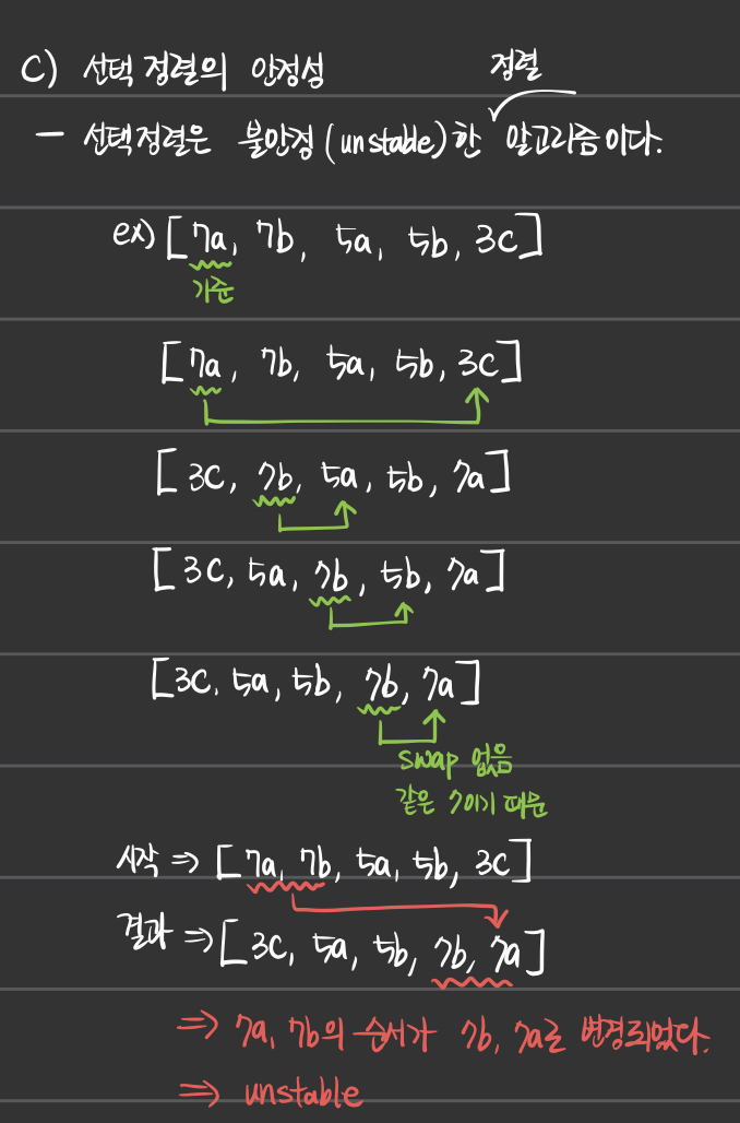 - 선택정렬은 불안정(unstable)한 알고리즘이다.