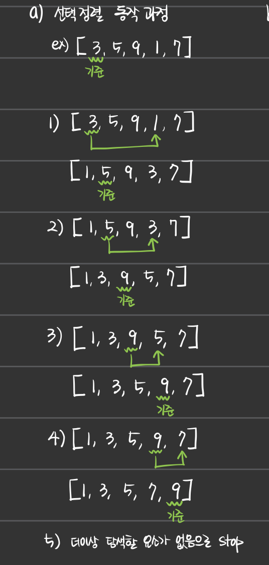 - 가장 왼쪽의 수(index 0)을 기준으로 최소값을 찾아 swap하여 정렬하는 알고리즘