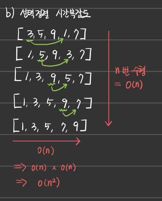 - 선택정렬은 버블정렬과 삽입정렬과 동일한 O(n^2)의 시간복잡도를 갖는다.