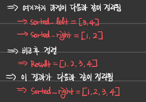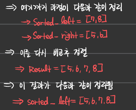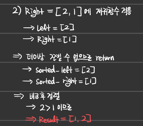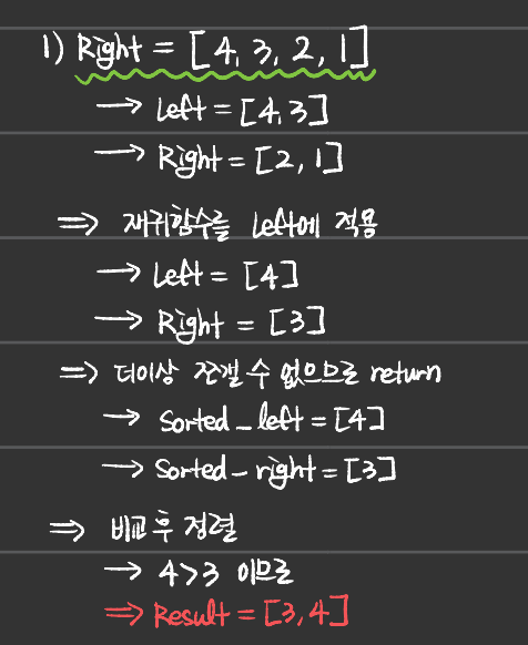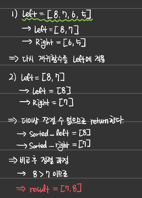 - 나 또한 재귀적 사고를 완벽히 할 줄 모르기에, 정렬과정을 직접 손으로 써내려가면서 이해하였다.