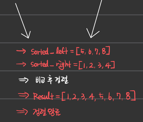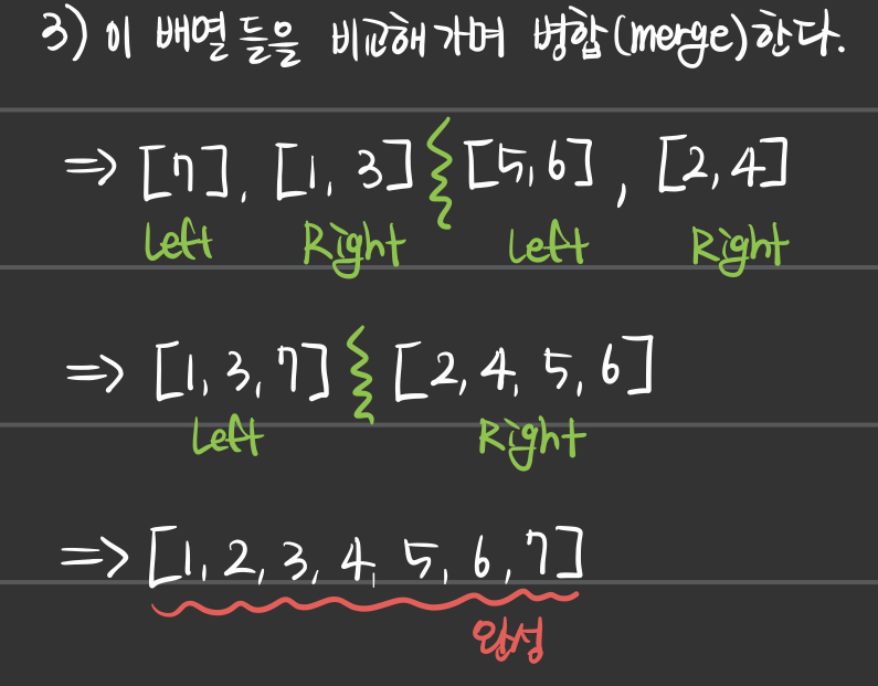 - 독립적으로 쪼개진 배열을 비교해가며 병합하여 하나의 정렬된 배열을 만드는 알고리즘이다.