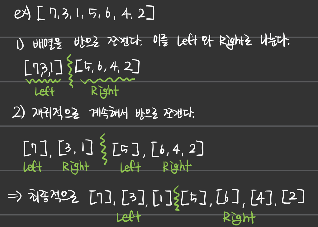 # - 반씩 쪼개진 배열을 Left, Right로 구분한다.
