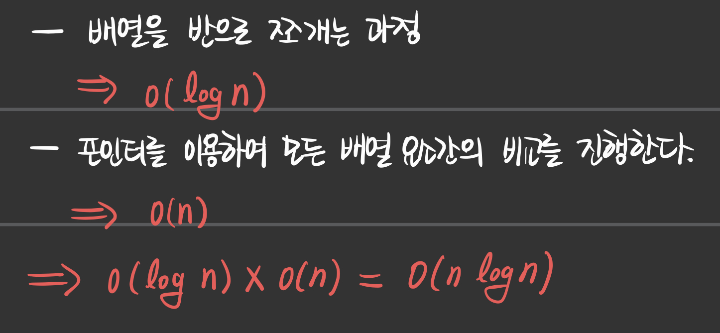 # - 각각의 독립된 배열 요소간의 비교를 통한 병합과정 => O(n)