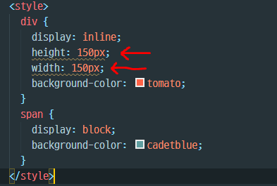 - 위의 코드를 보면 div의 display 속성을 inline으로 바꾸었더니 height와 width를 설정하는 코드에 경고 밑줄이 생겼다. 그 이유는 위에서도 말했듯이, inline속성을 갖는 요소는 너비와 높이를 가질 수 없기 때문이다.