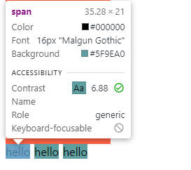 - 반대로 span태그는 inline태그이기 때문에 수평정렬이 가능하며 개발자 도구를 이용해 영역을 보았을 때 hello라는 문자열의 길이만큼만 영역을 차지하는 것을 볼 수 있다.