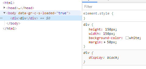 - 개발자 도구에서 확인해보니 div의 상하좌우에 margin 50px는 잘 적용되었다. 하지만 우측에서 볼 수 있듯이 div와 div를 감싸고 있는 body사이의 간격이 벌어진 것이 아니라 body의 margin이 늘어난 것을 볼 수 있다. 이것을 collapsing margins현상이라고 부른다.