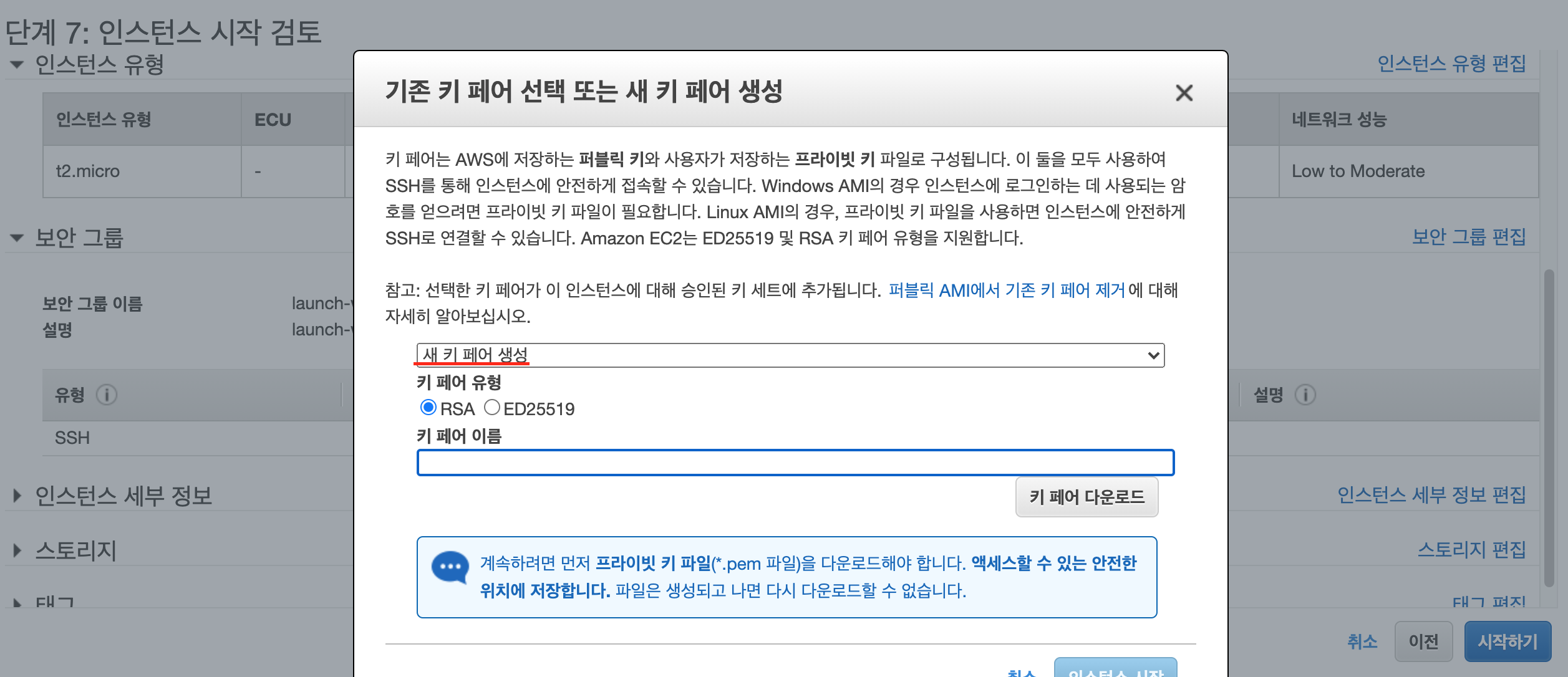 - 새롭게 생성하는 서버이므로 새 키 페어 생성 이라는 옵션을 선택하고
