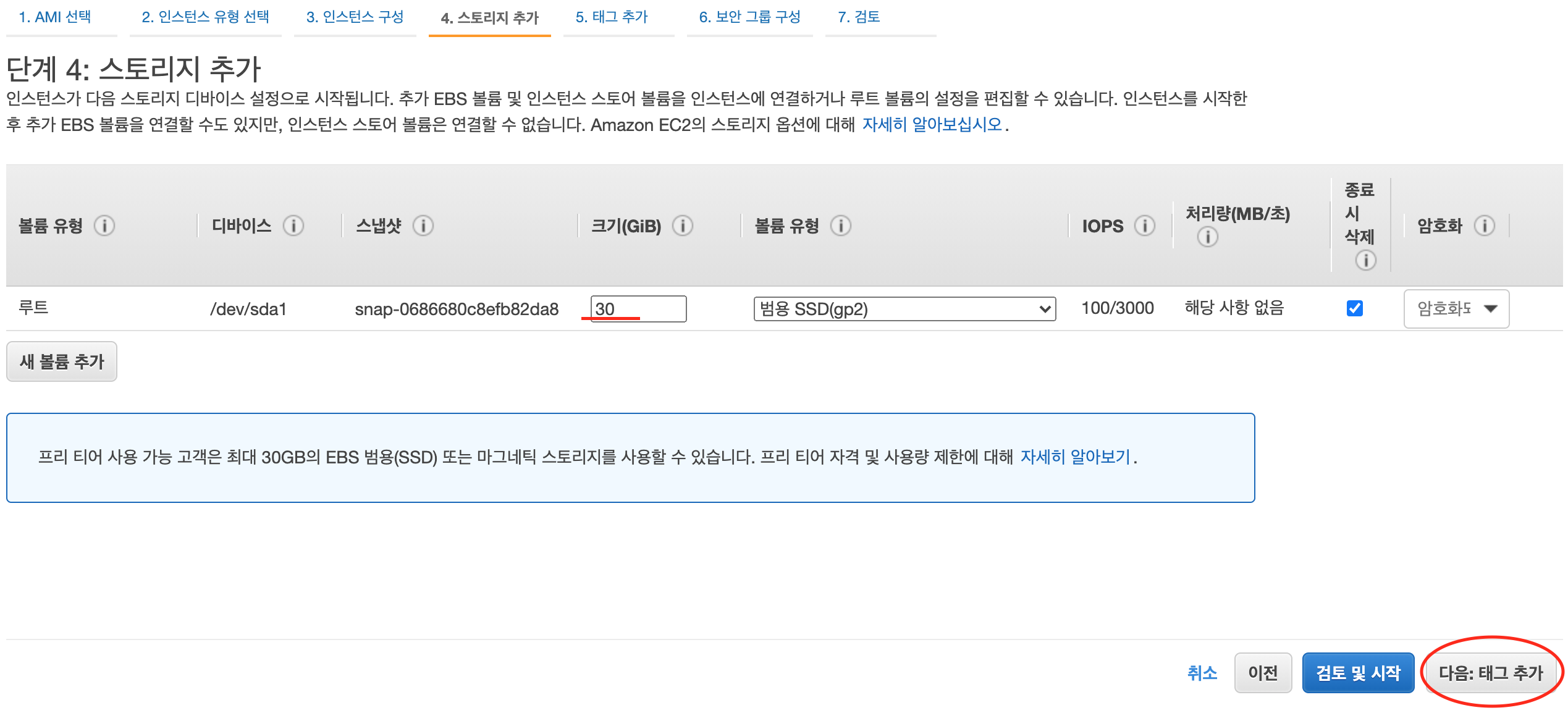 - 아래의 사진과 같이 30GB로 설정을 한 후, 다음 태그추가로 이동한다.