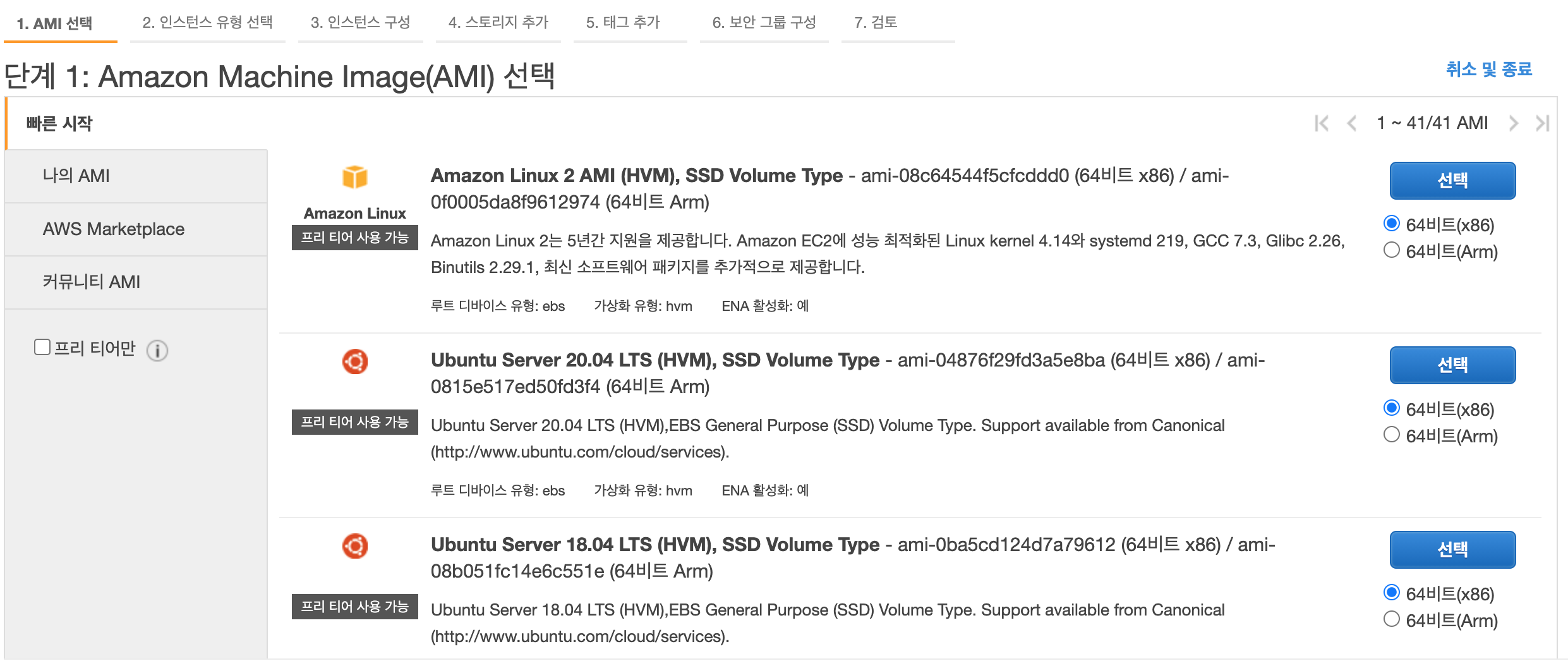- 인스턴스 시작 버튼을 누르면 아래의 사진과 같이 운영체제를 선택하여 설치하는 페이지가 등장한다.