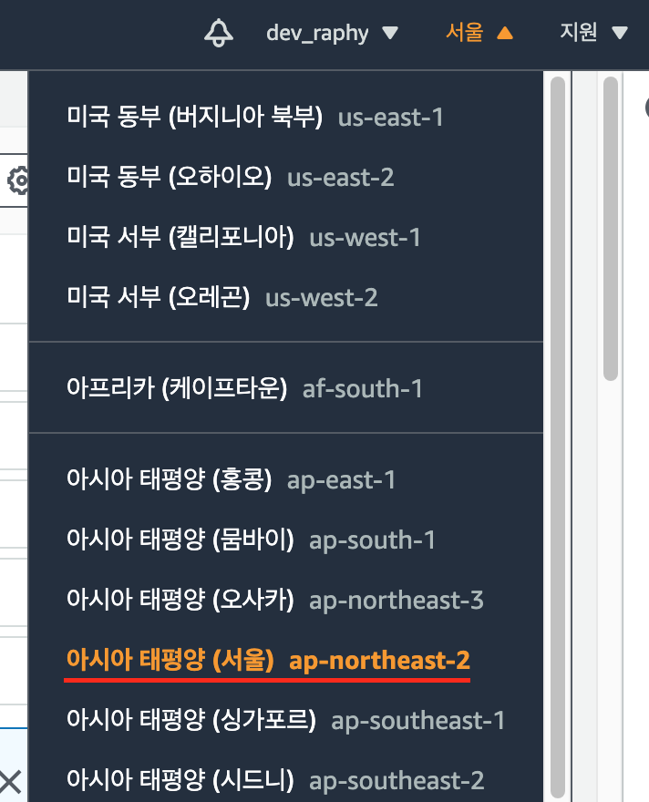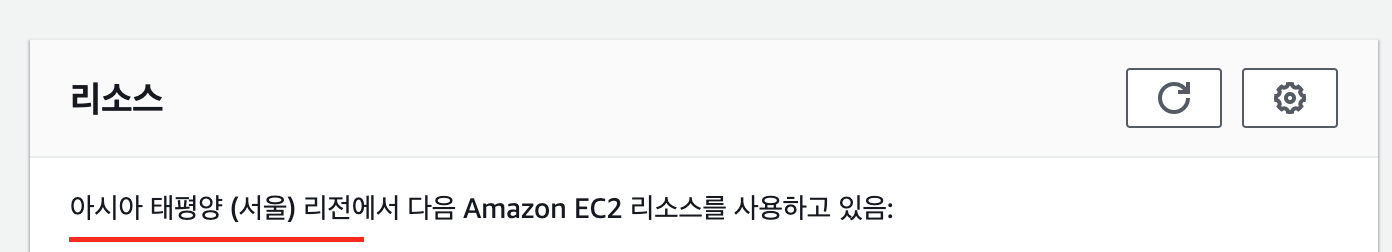 - EC2 대시보드에 들어가게되면, 우측 상단에 아이디 옆에 지역을 명시하는 부분이 있다.