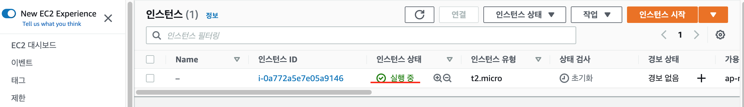 - 메뉴 중 인스턴스라는 메뉴를 클릭하면 다음과 같은 페이지가 나온다.