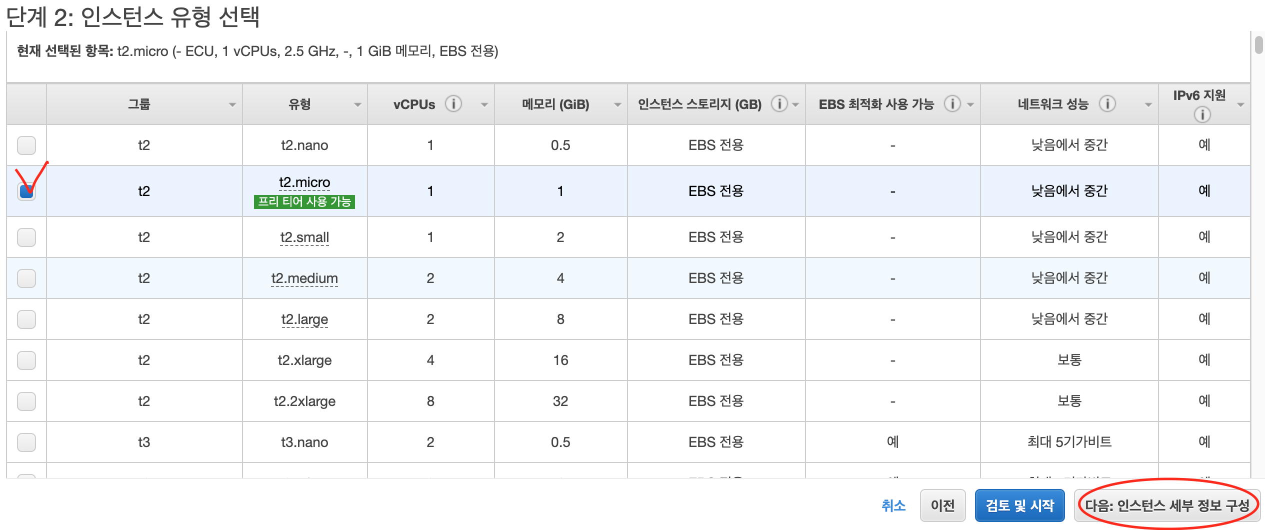 - 체크박스에 파란색 선택이 되었는지 확인한 후, 우측 하단의 인스턴스 세부정보 구성 버튼을 클릭한다.