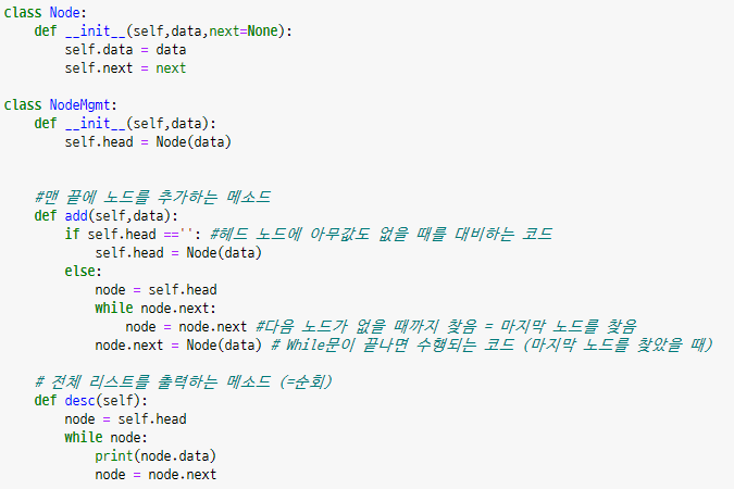 - 위의 코드와 기존의 연결리스트의 코드를 비교하여 어떤 차이가 있는지 공부하는 것이 중요하다.