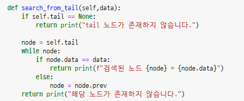 - head노드부터 검색하는 메소드와 큰 차이가 없습니다. head대신 tail을 next대신 prev를 사용하면 됩니다.