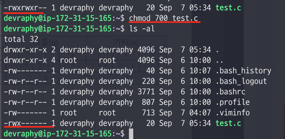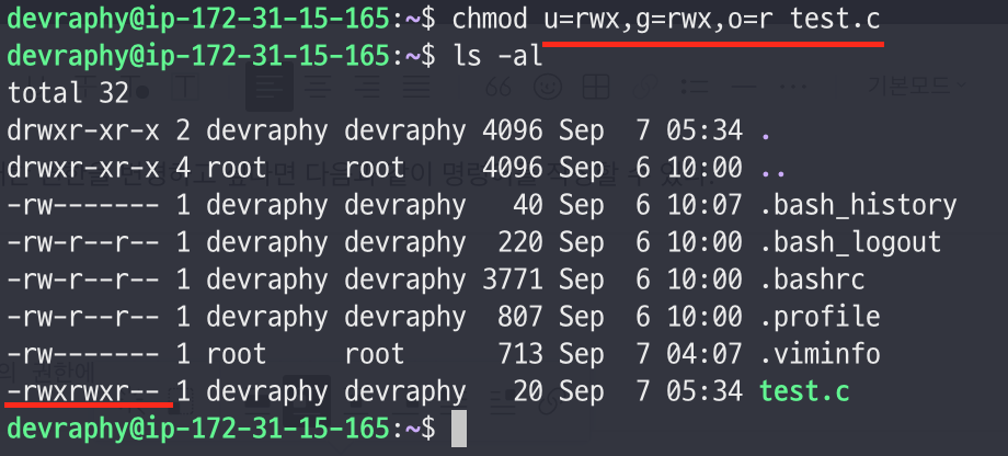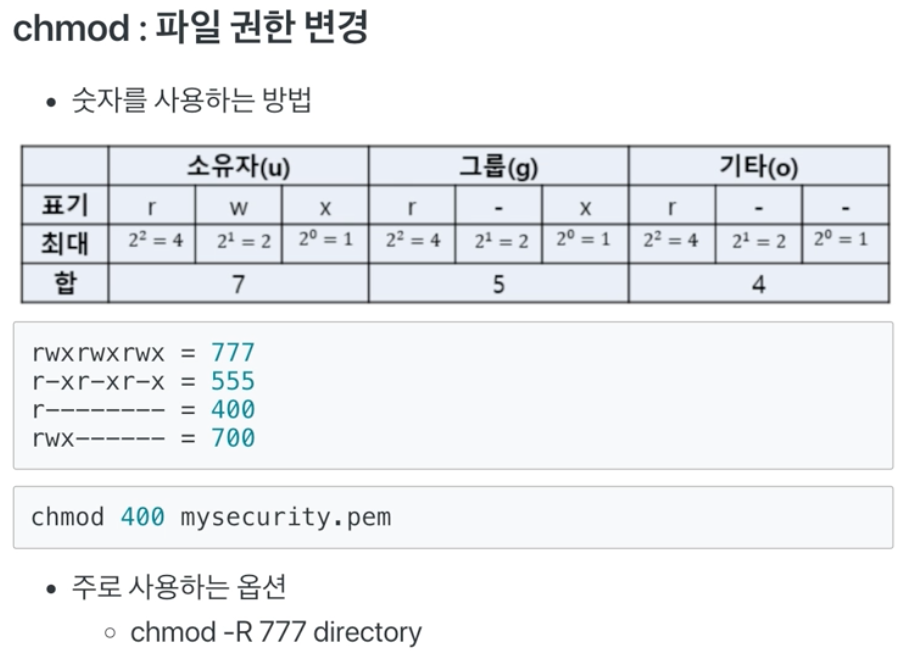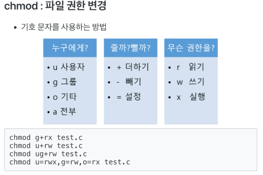 - 이 때 사용할 수 있는 명령어가 chmod(change mode)이다.