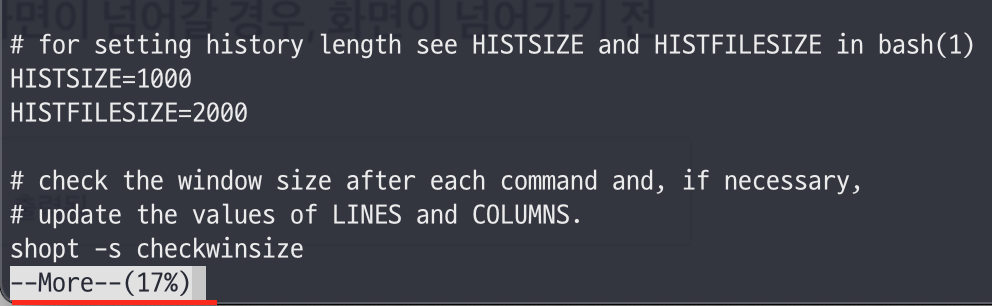 - 엔터를 누르면 1줄씩 더 볼 수 있으며, 스페이스바를 누르면 페이지로 넘어간다.