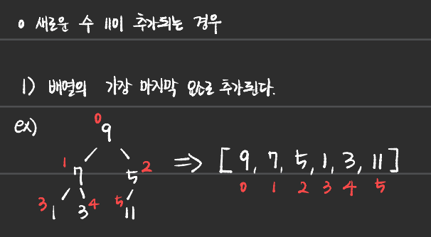 d) Heap에 새로운 수가 추가될 때, 배열로 표현하는 방법