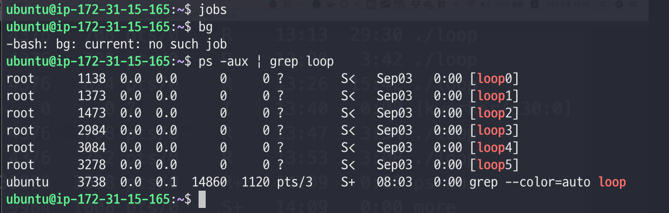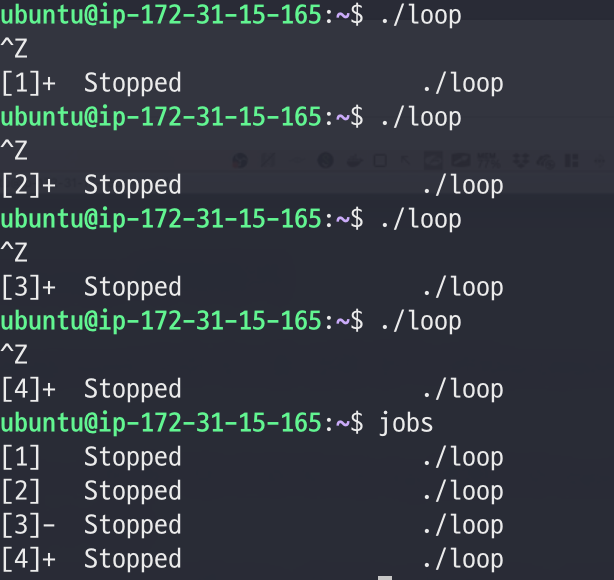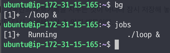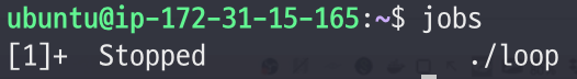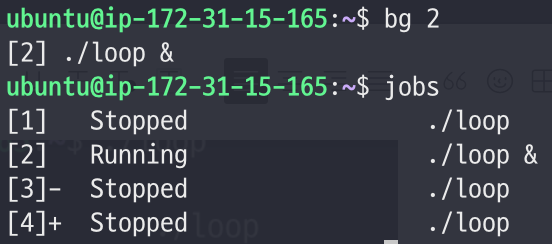 - 이렇게 jobs를 통해, 방금 중단시켰던 loop프로그램이 background process에 할당되어 있는 것을 알 수 있다.