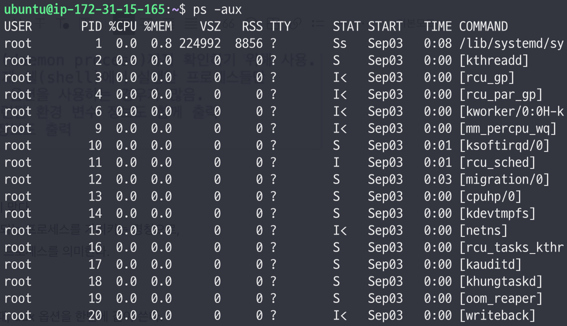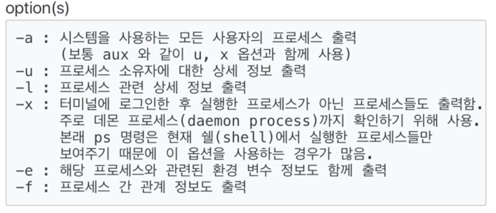 - 일반적으로 ps 명령어를 사용할 때, aux 옵션을 한번에 같이 쓴다.