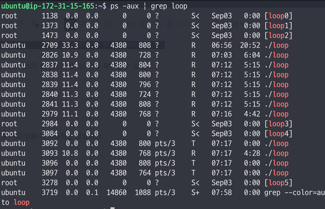 - grep 명령어를 사용하여 loop라는 문자열을 포함하는 프로세스를 검색한다.