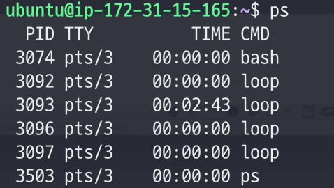 - 소유자가 ubuntu인 loop 프로세스가 위에서 실습하면서 실행한 프로세스다.