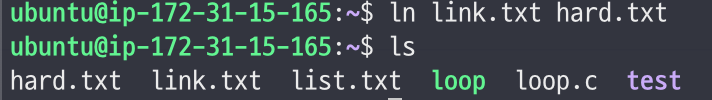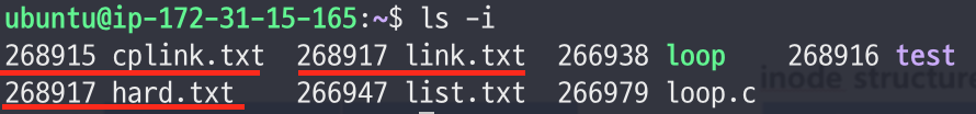 - inode번호를 확인해보면, 하드링크로 생성된 hard.txt는 link.txt와 동일한 inode 번호를 갖는다.