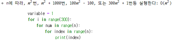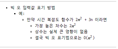 - n이란 입력값의 크기를 의미하는 것이고n에 의해 알고리즘이 받는 영향력(반복수)을 표기하는 것이다.