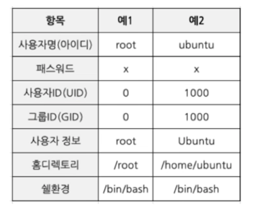 - 위의 표는 passwd 파일을 통해서 설정할 수 있는 정보다.
