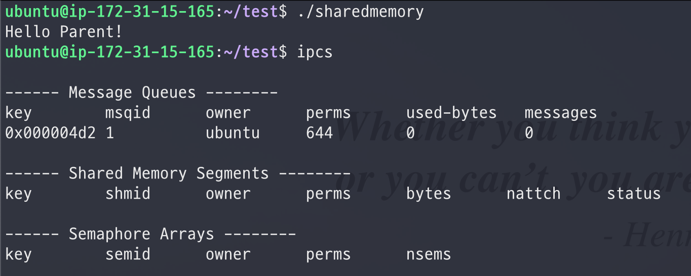 printf("%s\n", shmaddr_parent); // 공유 메모리 값을 읽음(read)