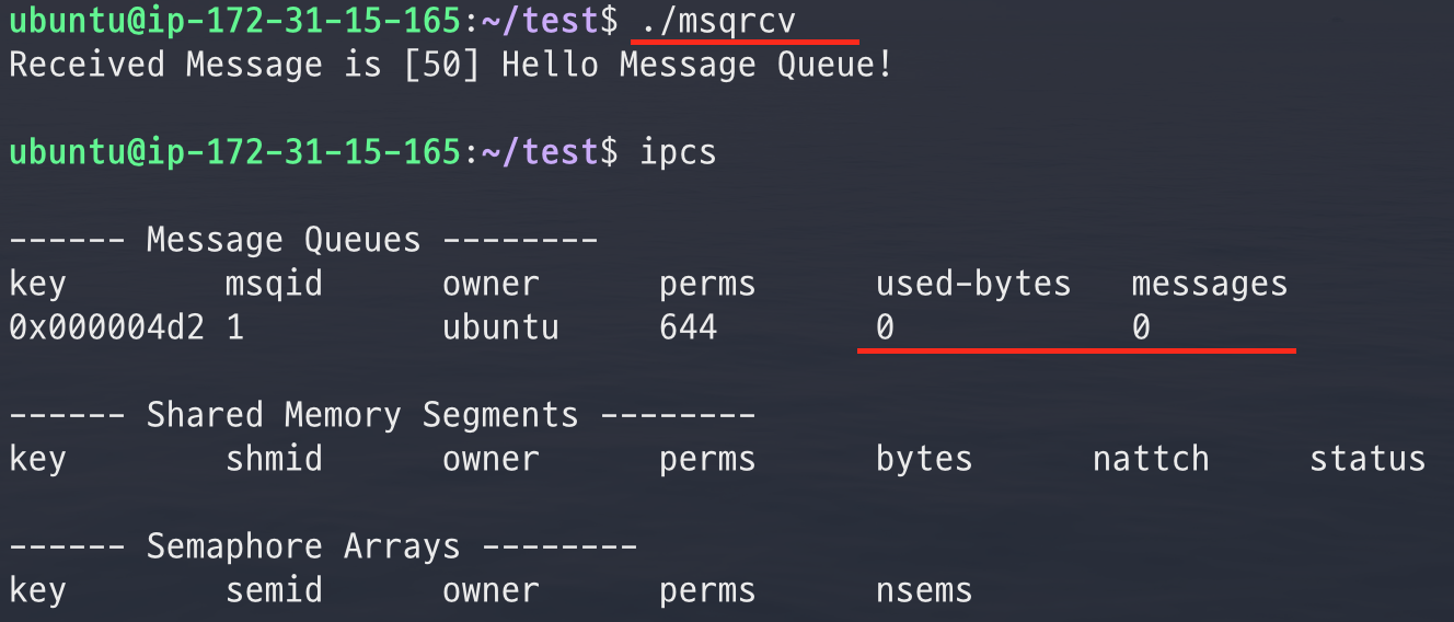 - 위의 사진은 Message queue를 전송한 후 ipcs명령어를 입력한 것이다.