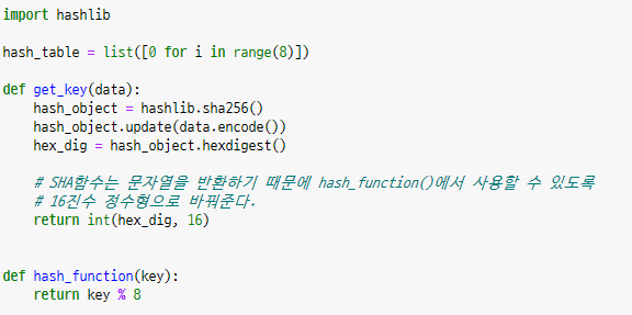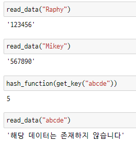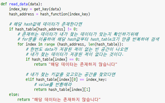 - 내가 찾는 data의 해시값(저장공간)에 data가 존재하는지 확인 / data가 없다면 저장된 적 없다는 뜻