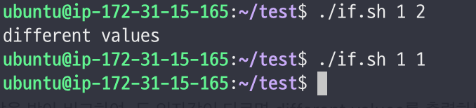 - 두개의 인자값을 받아 비교하여, 두 인자값이 다르면 different values를 출력하는 조건문을 만들어보자.