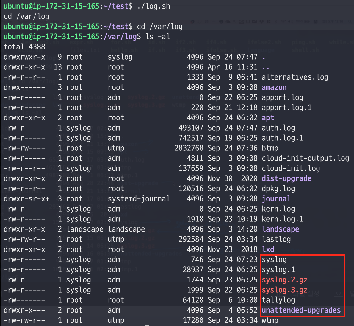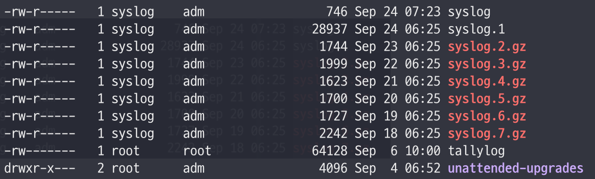 - /var/log 디렉토리로 이동해보면, 로그가 2일이상 경과되는 경우 압축파일로 보존되어 있는 것을 확인할 수 있다.