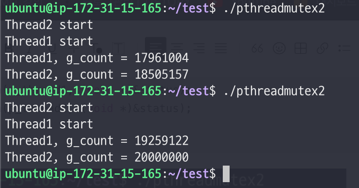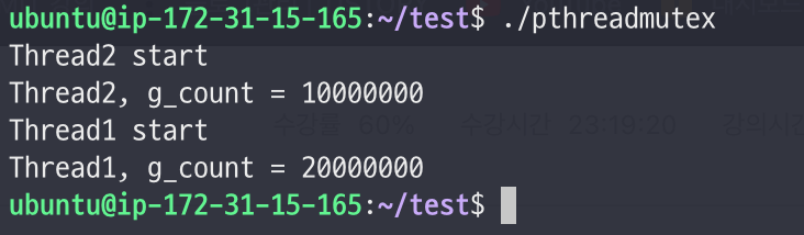 - 첫번째로 실행된 스레드(thread2)에서 g_count를 천만까지 연산했다.