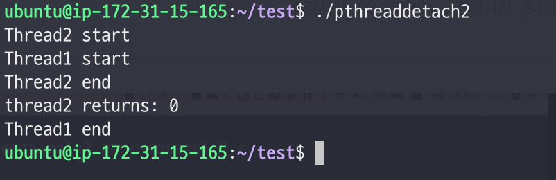 - thread1이 detach 되었기에 바로 thread2의 작업으로 넘어간 것을 확인할 수 있다.