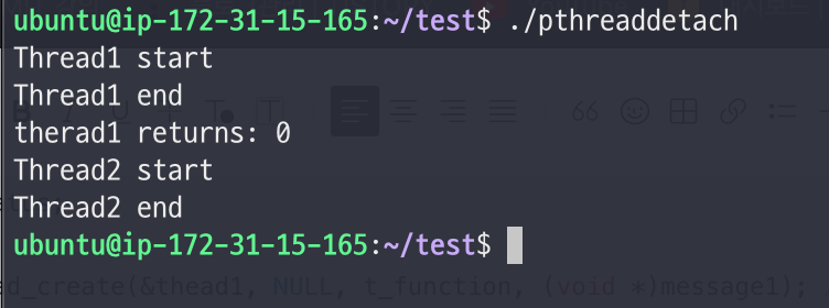 - thread1이 detach 되었기에 바로 thread2의 작업으로 넘어간 것을 확인할 수 있다.