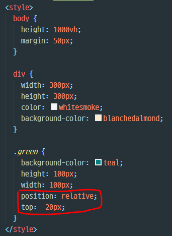 - 즉, 초록색 div의 기존 위치를 기준보다 상대적으로 -20px만큼 위쪽으로 움직였다는 의미이다.